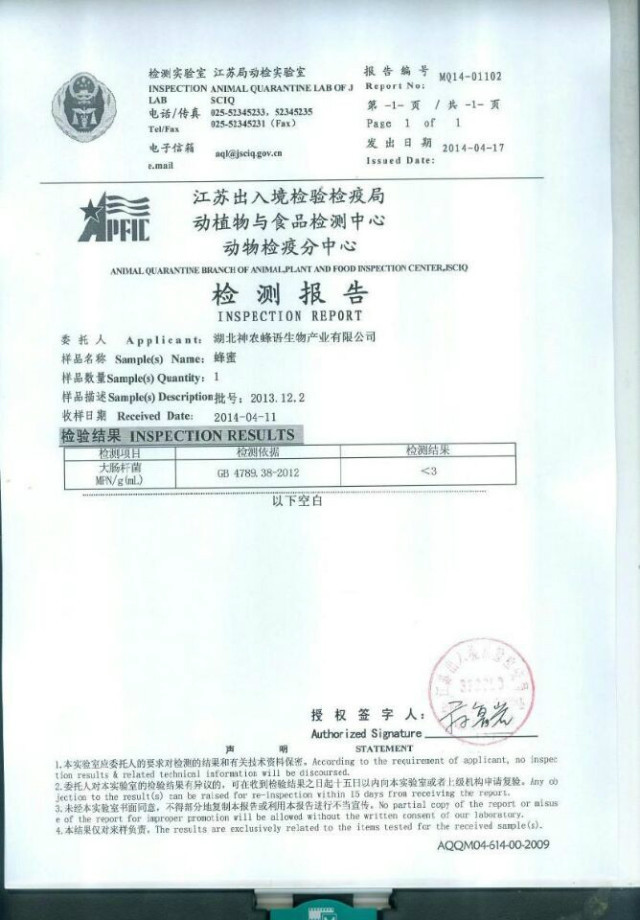 八、衛(wèi)生指標(biāo),致病源:大腸桿菌(GJ規(guī)定小于3合格),檢測(cè)小于3 在本次檢驗(yàn)中,上述的蜂蜜真實(shí)性檢測(cè)和獸藥殘留,GJ目前不做強(qiáng)制檢測(cè),因蜂蜜中的成分不為蜂蜜D有,這就為造假者提供了造假條件,也就是造成現(xiàn)在市場(chǎng)假蜂蜜盛行的Z根本原因,公司本次檢驗(yàn)指標(biāo),遠(yuǎn)遠(yuǎn)高于GJ檢測(cè)標(biāo)準(zhǔn),Q部合格!