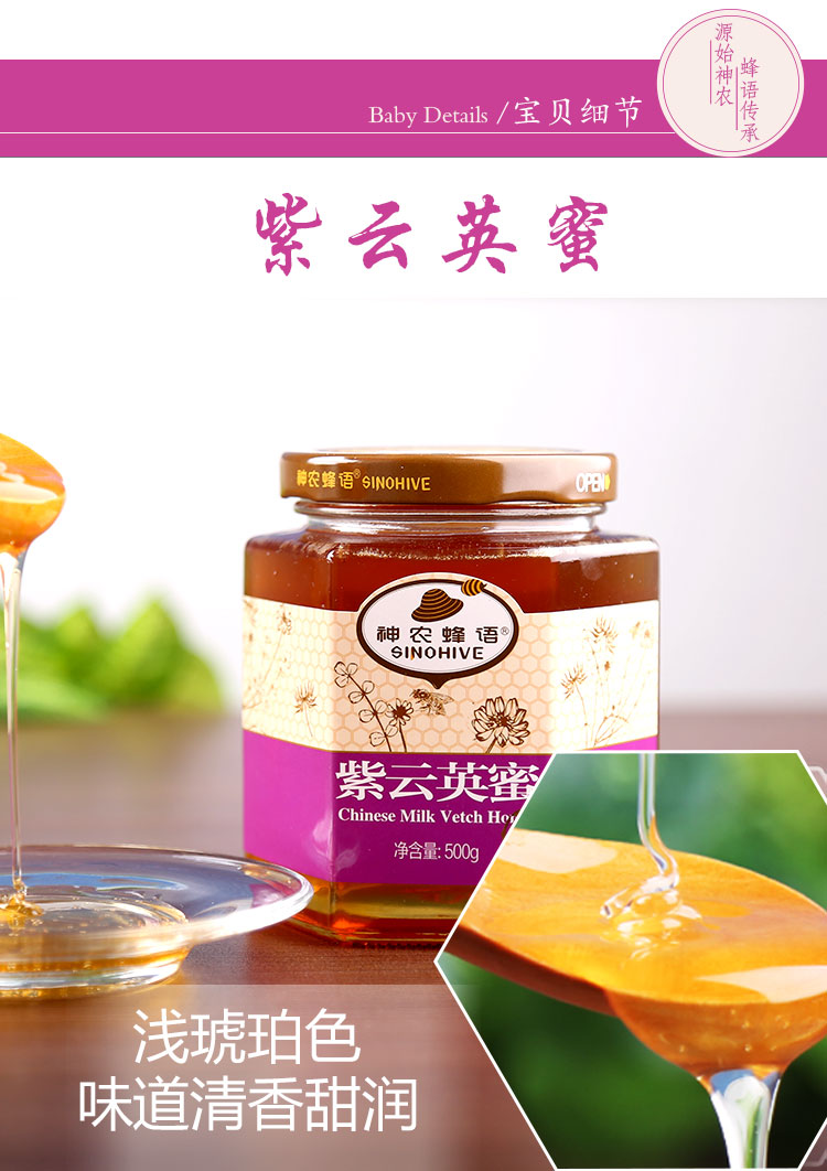 紫云英蜜色澤為淺琥珀色,結(jié)晶顆粒白色細(xì)膩;具有大自然清新宜人的草香味,甜而不膩,鮮潔清甜為一等蜜,深受國內(nèi)外市場歡迎。有祛風(fēng)明目,健脾益氣,解毒止痛,殺菌消炎等特殊保健功效。對風(fēng)痰咳嗽、喉痛、火眼痔瘡等有一定的輔助療效,是虛火旺盛人士之保健佳品。