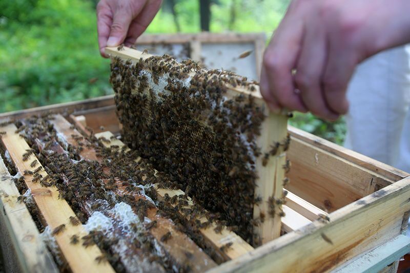 山莊很有特色,一排排整齊的蜂箱就在眼前,公司總經(jīng)理宋總代領(lǐng)網(wǎng)友觀看了真實的蜂箱。蜂王一般能活5-10年,比普通工蜂活的時間長,主要吃蜂王漿。一只工蜂的壽命只有30-40天。一斤蜂蜜要消耗掉450多只蜜蜂的生命。