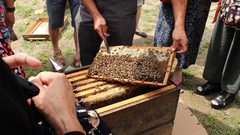 大家稍作休息后,工作人員為大家分發(fā)了蜂帽,在神農(nóng)蜂語(yǔ)養(yǎng)蜂專家孟師傅帶領(lǐng)下,大家觀看了山莊樹(shù)下的蜂箱。