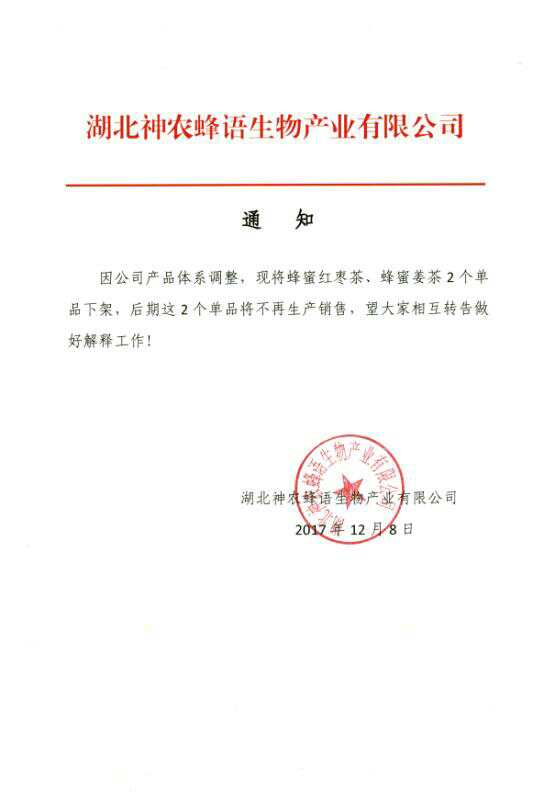 因公司產(chǎn)品體系調(diào)整,現(xiàn)將蜂蜜紅棗茶、蜂蜜姜茶2個單品下架,后期這2個單品將不再生產(chǎn)銷售,希望廣大用戶相互轉(zhuǎn)告。以下為文件掃描件。
