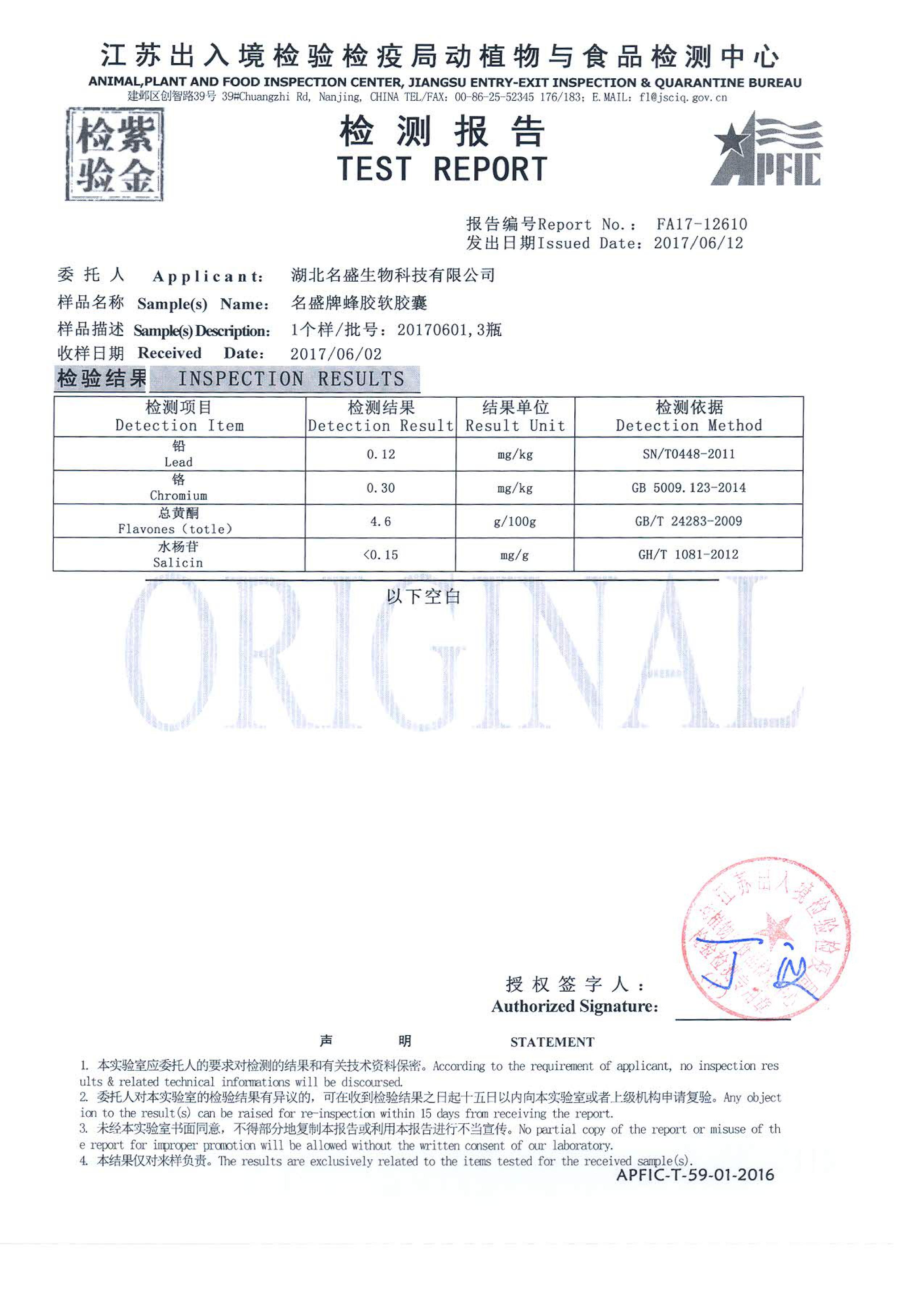 注:神農(nóng)蜂語委托湖北名盛生物科技有限公司生產(chǎn)蜂膠軟膠囊,故報(bào)告委托人寫的是后者。