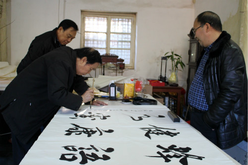 歐陽學忠先生正在創(chuàng)作。(依武當仙山,接神農(nóng)幽境,臨北調(diào)秀水,釀中華蜂蜜)