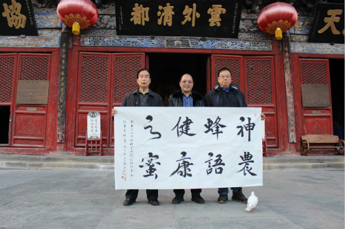 歐陽學忠先生(左一)和他的字。(神農(nóng)蜂語,健康之蜜)