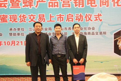 神農(nóng)蜂語總經(jīng)理宋學(xué)喜同中國蜂產(chǎn)品協(xié)會領(lǐng)導(dǎo)王啉(左)及趙小川(右)合影